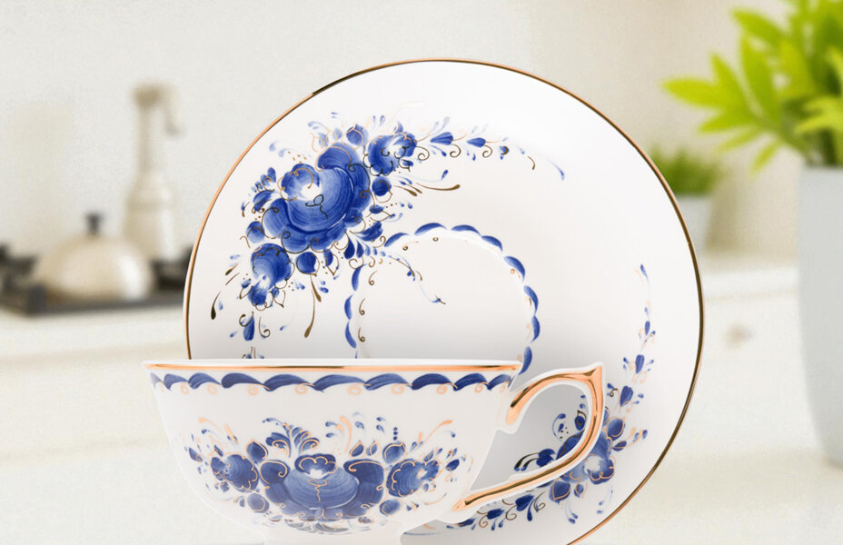 Чайная пара. Объединение "гжель". "Воробей" (Калейдоскоп), 250 мл, 24-х каратное золото