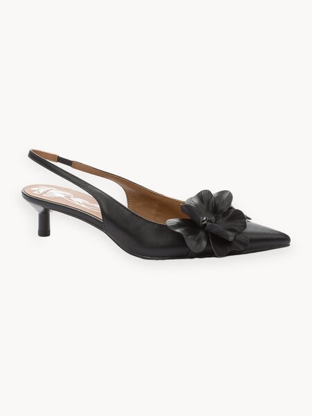 Черные женские туфли с объемными декоративными цветами сделают вас центром внимания! Модель с закрытым острым носом и открытой пяткой выполнена из высокотехнологичной кожи. Эластичный ремешок надежно фиксирует ногу при ходьбе. Легкая нескользящая подошва обеспечивает оптимальное сцепление с поверхностью.