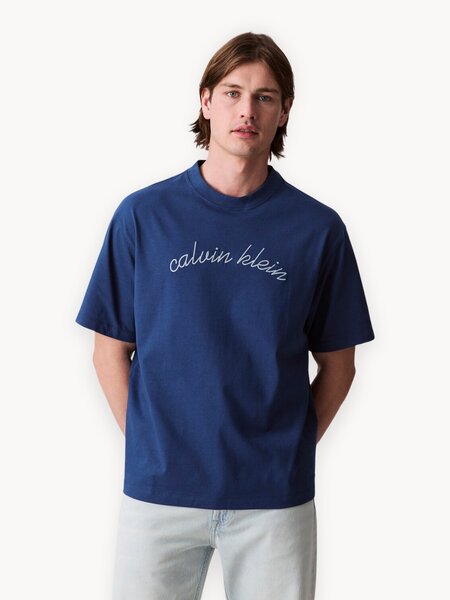 Эта футболка выделяется глубоким синим цветом и стильным логотипом Calvin Klein, нанесенным изящным шрифтом. Такой дизайн придает изделию современный и утонченный вид, подходящий для любых случаев — от неформальных обедов до вечерних прогулок.