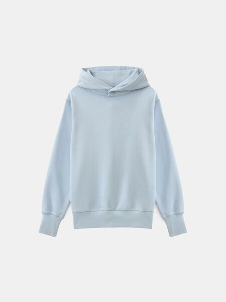 Толстовка из плотного 100% хлопка с капюшоном. Ширина горловины регулируется кнопкой. Низ и манжеты оформлены широкими окантовками из мягкого трикотажа.