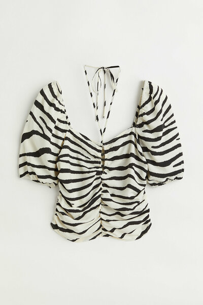 Блуза выполнена из драпированной ткани, что придает ей особую текстуру и легкость в уходе. Квадратный вырез добавляет стильности, а небольшое отверстие спереди придает оригинальность. Узкие бретели завязываются на шее сзади, обеспечивая удобную посадку.