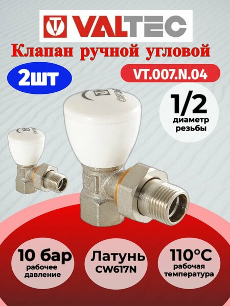 Угловой радиаторный клапан. Основное назначение – ручное плавное регулирование расхода теплоносителя через отопительный прибор. При замене регулировочной ручки на защитный колпачок может использоваться в качестве настроечного клапана. Наличие полусгона позволяет монтировать и демонтировать клапан без демонтажа трубопровода. Ремонтопригодный. Рабочая температура – до 110 °С, давление – до 10 бар. Резьба присоединений – внутренняя/наружная.