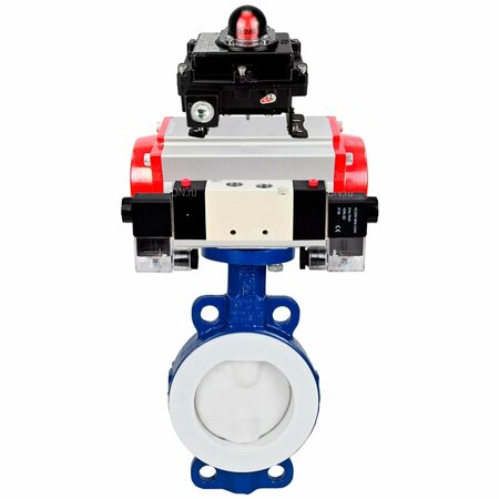 Данный футерованный затвор применяется как запорная или регулирующая арматура в различных системах (вода, щелочи, кислоты, растворители, окислители и прочие химические вещества не агрессивные по отношению к материалу уплотнения PTFE). Температура рабочей среды от -10 до +150 град. Корпус углеродистая сталь WCB, диск углеродистая сталь WCB, уплотнение PTFE. Присоединительные отверстия (к ответным фланцам) 4 шт*18 мм. Строительная длина 56 мм. Толщина футеровки 3 мм. Оснащён пневмоприводом SA-130 (с возвратными пружинами, рабочее давление 2-8 бар, окружающая среда от -20 до +80 град, крутящий момент (возврат пружин 0 град.) 105 Нм), пневмораспределителем PND1-S2EM-52-2-T10-220VAC (IP65, окружающая среда от -5 до +50 град, рабочее давление 1.5-8 бар, резьба рабочих портов 3/8'), БКВ LSB-410-02ExM12 взрывозащищенным - передаёт сигнал о положении привода в систему управления (IP65, 220 В, ток 10 А, окружающая среда от -25 до +80 град, кабельные вводы 2хNPT 1/2').