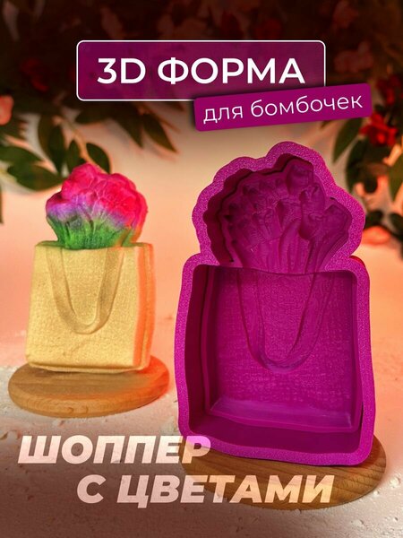 3D форма для бомбочек Шоппер с цветами Тематика: 8 марта Размеры готовой бомбочки для ванны: 11см*6,5см*2,5см Примерный вес готового изделия: 130 грамм (может варьироваться в зависимости от состава смеси) Мы уверены в качестве изготавливаемых нами 3D форм, но для того, чтобы они прослужили вам очень долго необходимо соблюдать небольшой список правил по уходу, а именно: - Не держать под прямыми солнечными лучами - Не подвергать температуре выше 60 градусов - Не замачивать в воде и других жидкостях - При промывке форм не использовать моющие средства, растворители и т. п. - Хранить в сухом и тёмном месте - После использования форм промыть их под проточной водой и сразу высушить, либо протереть влажной тканью и также оставить сушиться При соблюдении всех вышеперечисленных пунктов наши формы прослужат вам очень долгое время!