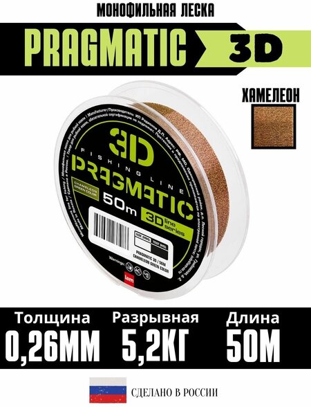 Рыболовная леска хамелеон Pragmatic 3D Chameleon / леска для рыбалки Хамелеон 3Д становится практически незаметной в воде, благодаря уникальному нанесению цвета на полотно. Закомуфлированный раскрас не отпугнет даже самую осторожную рыбу. Монофильная леска для рыбалки Pragmatic 3D отлично держит узлы, устойчива к истиранию. В меру эластичная и тонет в воде. Имеет малую память и очень скользкая. Является универсальной леской как для летней рыбалки, так и для зимней рыбалки. В серии Pragmatic мы приложили максимум усилий для снижения стоимости упаковки. Чтобы каждый рыбак, вне зависимости от возможностей, получил качественный продукт по минимальной цене. Пластиковые коробки от лески обычно идут на выброс и никак не влияют на уловистость. Зато влияют на конечную цену продукта. Мы убрали коробки, заменив их на качественную термоусадочную пленку, снизив благодаря этому себестоимость и сохранили качество самого полотна лески.