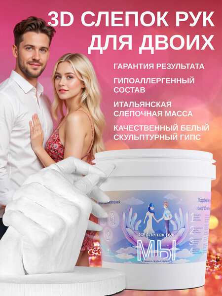 Лимитированная серия. С помощью набора создается 3D скульптура держащихся вместе рук со 100% детализации мельчайших подробностей рельефа кожи и отпечатков пальцев. Набор произведен из качественных компонентов из Италии, Германии, России. Уникальная технология, при которой слепочная масса меняет цвет на разных этапах создания, делает процесс скульптуры захватывающим приключением, а подробная инструкция, входящая в комплект, делает процесс максимально комфортным, лёгким и безопасным. В набор входит: • Гипсовая смесь премиум-класса • Контейнер для смешивания • Подробная инструкция Как это работает: 1. Смешайте гипсовую смесь с водой. 2. Погрузите руки в смесь и подождите, пока она застынет. 3. Аккуратно извлеките руки и дайте слепку высохнуть. 4. Декорируйте слепок по вашему вкусу и добавьте его в праздничный декор. Набор 3D слепок - прекрасный подарок для любителей творчества и рукоделия на любое торжество или праздник: День Святого Валентина, 23 Февраля, 8 Марта, Новый год, Годовщину, Свадьбу, День рождения и просто незаурядный Подарок без повода/ Мы заботимся о каждой детали: Отбор лучших материалов, тщательная упаковка и внимание к деталям — все это делает наш набор не просто товаром, а частью вашей истории любви и творчества/