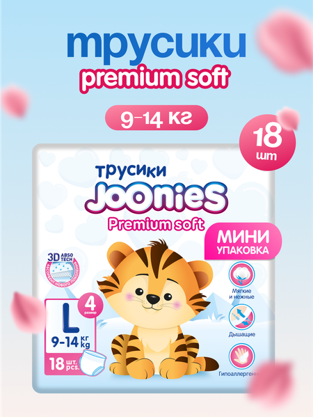 Трусики нового поколения, стали ещё лучше - мы добавили больше абсорбента, чтобы ультратонкие трусики TM Joonies Premium Soft впитывали ЕЩЕ БОЛЬШЕ жидкости! Внешняя поверхность трусиков напоминает КАШЕМИР, они очень приятны телу и не заметны под одеждой. Равномерное впитывание по всей поверхности внутреннего слоя позволяет малышу чувствовать себя комфортно в трусиках до 12 часов! 3D рельеф внутренней поверхности уменьшает площадь касания подгузника с кожей ребенка, тем самым улучшает воздухообмен и помогает избежать раздражения и опрелостей. Благодаря двухслойному материалу, поверхность всегда остается сухой. Впитывающий слой трусиков состоит из премиального современного абсорбента, воздушной целлюлозы и воздушного нетканого материала, благодаря чему абсорбирующий слой не раздуется и не скомкается. При надевании подгузника, не забывайте поправлять внутренние резиночки-бортики, которые блокируют боковые протекания. У каждого размера теперь свой милейший дизайн трусиков.