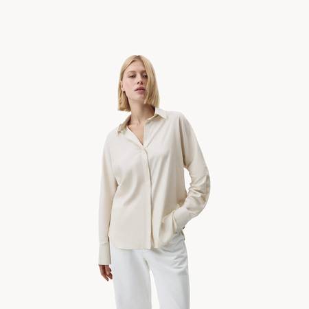 Блуза свободного кроя с цельнокроенным рукавом из мягкой ткани с лиоцеллом и хлопком. Фронтальная супатная застёжка. Отложной воротник. Длинные рукава с манжетами. Закругленный нижний край. Длина до бедер.