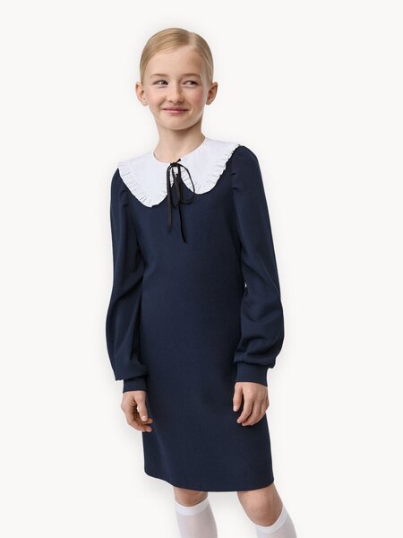 Модное темно-синее платье для девочки из школьной коллекции бренда sela, декорированное фигурным белым воротником. Модель выполнена из плотного трикотажа на основе вискозы, который прост в уходе, приятен к телу и хорошо держит форму. Платье имеет полуприлегающий силуэт с изогнутыми вытачками на спинке, подчеркивающими фигуру девочки. Длинные рукава с декоративными сборками на плечах и эластичными манжетами делают платье идеальным выбором для прохладных дней. Застежка-молния на спинке обеспечивает легкость при одевании и снятии, а длина платья до колена позволяет девочке чувствовать себя комфортно и свободно во время учебы. Акцентная деталь в виде съемного хлопкового воротника на пуговицах с декоративной атласной лентой придает наряду уникальность и открывает возможности для творческих экспериментов с образами. Короткое школьное платье с белым воротником - отличный выбор для тех, кто хочет выглядеть модно и элегантно в школе. Выбирая школьную форму от sela, вы можете быть уверены в качестве и комфорте вашего ребенка на протяжении всего учебного года.