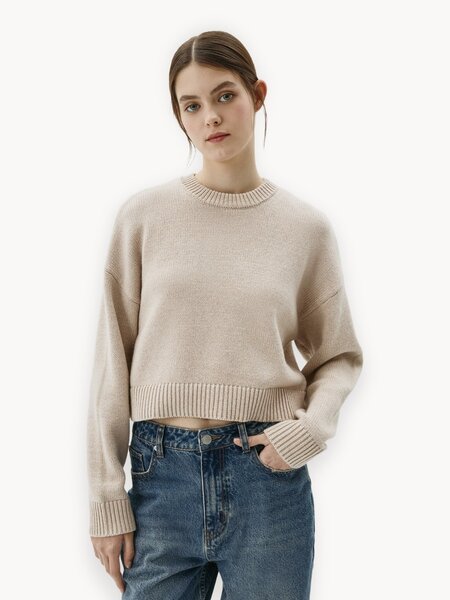Женский укороченный вязаный джемпер бренда SELA из мягкого смесового трикотажа с содержанием шерсти, который дарит ощущение уюта и тепла. Свободный крой со спущенной линией плеча и длинными рукавами делает этот джемпер универсальным и подходящим для фигуры любого типа. Он не сковывает движений и позволяет чувствовать себя комфортно в любой ситуации. Круглый вырез горловины добавляет нежности и женственности, прекрасно подчеркивая линию шеи. Манжеты и подол выполнены в рубчик, что придает дополнительную текстуру и создает более законченный образ. Этот джемпер станет отличным дополнением к любому гардеробу, позволяя легко сочетать его с различными предметами одежды. На модели представлен размер S. Рост модели 175 см.