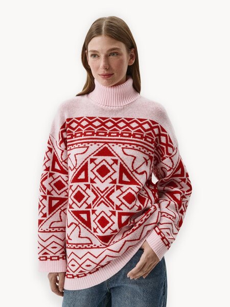 Женский вязаный свитер бренда SELA с ярким жаккардовым орнаментом. Мягкий смесовой трикотаж с содержанием шерсти приятен к телу и дарит ощущение комфорта и тепла. Свободный прямой крой с заниженной линией плеча делает этот свитер универсальным и подходящим для фигуры любого типа. Модель дополнена воротником-гольф и длинными рукавами. Воротник, манжеты и подол оформлены рибовой резинкой, которая придает дополнительную текстуру и создает более законченный образ. Свитер легко сочетается с различными низами и обувью, позволяя создавать разнообразные и интересные образы на каждый день. На модели представлен размер S. Рост модели 175 см.