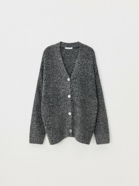 Кардиган выполнен из качественных материалов, таких как пушистая пряжа и люрекс, что обеспечивает долговечность и сохранение первоначального вида.