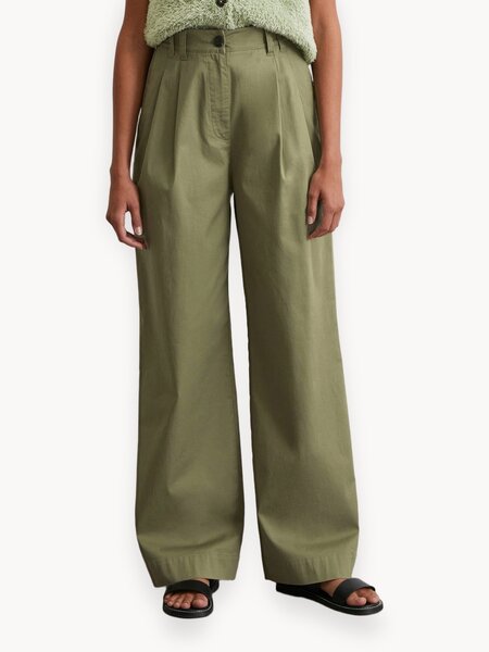 Широкие брюки Marc O'Polo из смесового хлопка Лаконичная модель выполнена из эластичного твила – идеальный вариант для тех, кто не хочет идти на компромисс между комфортом и стилем. Брюки с широкими штанинами – одни из самых универсальных и многофункциональных брюк за счет своей комбинаторности. Они идеально подходят для самых разных случаев. Изготовлены из прочного твила, состоящего из смеси органического хлопка и эластана. Модель стандартной посадки на талии дополнена классическим поясом со шлевками для ремня и защипами. Застегивается на пуговицу и молнию. Большей практичности изделию добавляют просторные карманы спереди и карманами на пуговицах сзади.