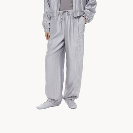 Брюки изготовлены из сияющей ткани в полоску, что добавляет им стильный вид и делает их подходящими для различных повседневных ситуаций.