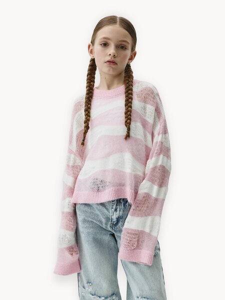 Джемпер комбинированной вязки для девочки бренда SELA, декорированный жаккардовым рисунком. Мягкая смесовая пряжа с содержанием шерсти. Свободный прямой крой со спущенным плечом. Круглый вырез горловины и длинный рукав. Рельефная резинка на горловине, манжетах и подоле.