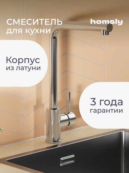 Современный кухонный смеситель Homsly - функциональное, надежное и стильное решение для кухни: ㅤ - нержавеющий корпус из латуни ㅤ - стойкое долговечное хромированное покрытие. Устойчиво к жесткой и щелочной воде ㅤ - экономичный расход (установлен аэратор) ㅤ - легкая очистка аэратора ㅤ - крепеж и длинная подводка входят в комплект ㅤ - поворотный излив, 360 градусов ㅤ Смеситель можно установить как на столешницу, так и на мойку. ㅤ Гарантия 7 лет на корпус, 3 года на комплектующие.