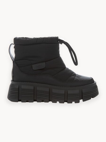 Практичные зимние полусапоги созданы для отдыха на природе. Модель из бежевого стеганого нейлона и черного высокотехнологичного нубука утеплена подкладкой и стелькой из шерсти. Затягивающийся эластичный шнур позволяет регулировать ширину голенища. Высокая платформа сочетается с удобной амортизирующей подошвой.