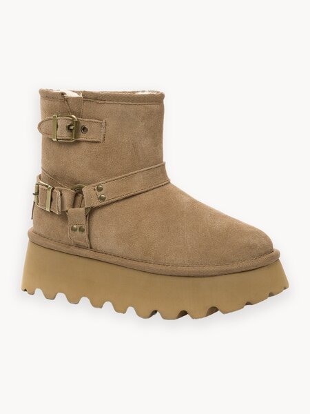 Зимние женские полусапоги из бежевой натуральной замши понравятся тем, кто предпочитает традиционные материалы. Модель украшена стильными декоративными ремешками с золотистыми пряжками. Теплая подкладка и стелька из натуральной шерсти не дадут ноге замерзнуть. Невесомая подошва гарантирует комфорт во время ходьбы.
