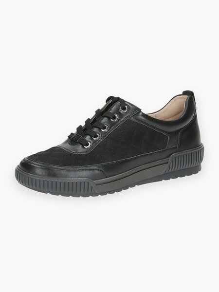 Кеды женские из натуральной кожи от немецкого бренда Caprice (Каприс) дополнены фирменной воздушной стелькой Airmotion (Эйрмоушен), которая обеспечивает хороший микроклимат внутри обуви, снижение нагрузки при ходьбе и легкий массажный эффект. С помощью шнуровки вы можете идеально отрегулировать посадку по ноге. Эти демисезонные кроссовки сочетают актуальный дизайн с ромбовидной стежкой и сочетанием разных фактур, практичность и комфорт, это оптимальный выбор для повседневной носки. Комбинируйте их с любой одеждой, от джинсов до костюмов, чтобы всегда быть в тренде и везде успевать. Удобная колодка предназначена для ноги средней полноты G(7). Высота подошвы в пяточной части - 2,5 см. Цвет: черный. Верх и стелька выполнены из натуральной кожи, что дарит ногам ощущение комфорта и свежести. Подкладка сделана из современного износостойкого синтетического материала, мягкого и комфортного в носке. Подошва изготовлена из термоэластопласта – лёгкого материала, который отлично сгибается и обеспечивает хорошее сцепление с поверхностью. Мы всегда очень рады вашим отзывам, ведь они помогают нам стать лучше!