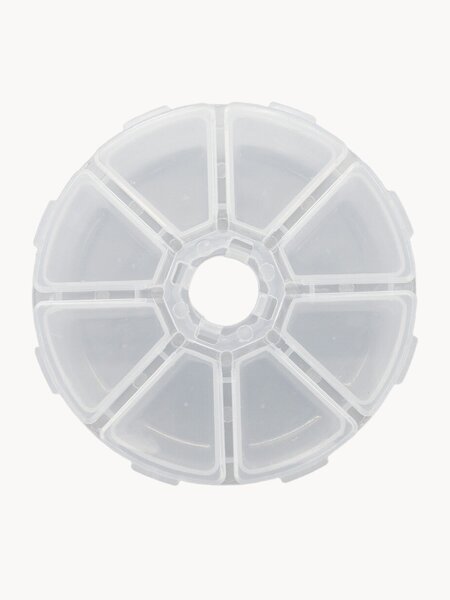 Контейнер для хранения бисера и мелочей - это не просто органайзер, а настоящий помощник для любой рукодельницы, которая ценит порядок и удобство в работе. Он представляет собой компактный кейс круглой формы из 8 секций, идеально подходящий для хранения различных мелких элементов. Каждая ячейка снабжена надежно закрывающейся крышкой, которая предохраняет содержимое от высыпания и загрязнений, делая контейнер идеальным для хранения в дороге. В ячейках можно разложить бисер, стразы, бусины, пуговицы, фурнитуру и другие мелкие детали, необходимые для создания неповторимых украшений, одежды и аксессуаров. Это особенно важно для тех, кто занимается вышивкой, бисероплетением, созданием украшений из полимерной глины или других видов рукоделия, где требуется работа с мелкими элементами. Кроме того, в нем удобно хранить таблетки, капсулы и другие медикаменты в отдельности, чтобы не перепутать. Отлично подходит для рыболовных принадлежностей. Органайзер для мелочей изготовлен из прочного прозрачного пластика, устойчивого к механическим повреждениям. Материал сохраняет свою форму на протяжении длительного времени. Пластиковый контенер для хранения меочей – это инвестиция в ваш комфорт, удобство и порядок.
