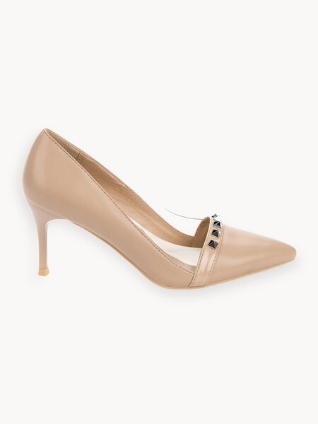 Модные туфли-лодочки с прозрачными вставками по бокам соблазнительно подчеркивают изгибы стопы. Они выполнены из высокотехнологичной кожи и украшены вставкой с металлическими заклепками. Образ завершает каблук средней высоты.