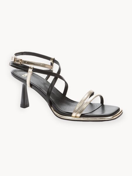 Женские босоножки с тонкими черными и золотистыми ремешками соблазнительно подчеркивают изгибы стопы. Модель с открытым квадратным носом выполнена из высокотехнологичной кожи. Регулируемый ремешок на щиколотке надежно фиксирует ногу. Каблук-рюмка средней высоты и легкая нескользящая подошва не сковывают движений.