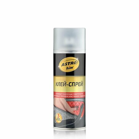 ASTROhim Клей-спрей - высококачественный аэрозольный клей для склеивания между собой в любых комбинациях тканных, нетканых, в том числе пористых материалов (натуральной и искусственной кожи, тканей, войлока, картона, бумаги, резины, поролона, минеральной ваты и др.), дерева, пластиков, а также приклеивания их на твердые несущие поверхности из пластика, металла, дерева, стекла и проч. Может использоваться в ремонте сидений и обивки салона, для оклейки корпусов сабвуферов и музыкальных полок, для приклеивания элементов отделки в автомобиле, при монтаже шумо- и теплоизоляции. Позволяет создать прочное эластичное соединение, устойчивое к влаге и перепадам температур. Может использоваться для создания соединений разной прочности: временных, долговременных или работающих под нагрузкой. Обладает суперлипкостью, которая позволяет тут же схватиться соединению, в то же время обеспечивая возможность поменять позиционирование склеиваемых материалов в течение 15 минут после нанесения клея. Обладает низкой способностью к впитыванию и отличными укрывающими свойствами. Равномерно наносится и быстро высыхает. Удобен для склеивания поверхностей больших площадей. Специальная распылительная головка с изменяемой геометрией факела распыла позволяет наносить клей дозированно и направленно. рекомендации ПО использованию Перед использованием очистите и обезжирьте склеиваемые поверхности. Предварительно опробуйте клей на локальном участке. Для создания качественного соединения работы производить при температуре окружающей среды от +15 до +25 ℃. Перед нанесением клея энергично встряхните баллон в течение 30 секунд. Для создания временной фиксации (только для прочных и непористых поверхностей): нанесите на одну из поверхностей тонкий ровный слой клея с расстояния 20-30 см. Соедините детали через несколько секунд. Оставьте на 1-2 минуты для высыхания. Для создания долговременной склейки: нанесите клей ровным слоем на обе поверхности с расстояния 20-30 см и оставьте на 2 минуты. Затем плотно прижмите друг к другу поверхности на 5-10 секунд. При склеивании пористых и сильно впитывающих поверхностей в случае необходимости клей наносится в 2 слоя. При создании ответственных соединений, работающих под нагрузкой, необходима выдержка склейки не менее 24 ч. После использования клея необходимо перевернуть баллон вверх дном и продуть сопло до тех пор, пока не начнет выходить газ.