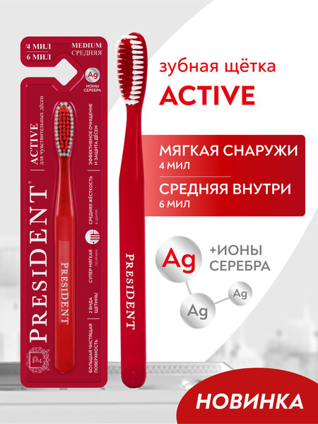 PRESIDENT Active – зубная щётка для проблемных и чувствительных дёсен, для защиты дёсен от кровоточивости. Комбинация двух видов щетины обеспечивает высокую эффективность очищения зубов и бережный уход за дёснами: Щетина средней жёсткости (6 МИЛ) В центре обеспечивает быстрое и тщательное очищение всех участков зубного ряда, супермягкая щетина ПО краям (4 МИЛ) мягко воздействует на дёсны, бережно очищая зубодесневую зону, ионы серебра в составе щетин уменьшают размножение бактерий. Причина кровоточивости дёсен – бактерии, вызывающие различные заболевания полости рта. По результатам клинического испытания мягкой щетины с ионами серебра, которая используется в ЗЩ Актив, 99% бактерий Escherichia coli и Staphylococcus aureus разрушаются в результате контакта с щетиной