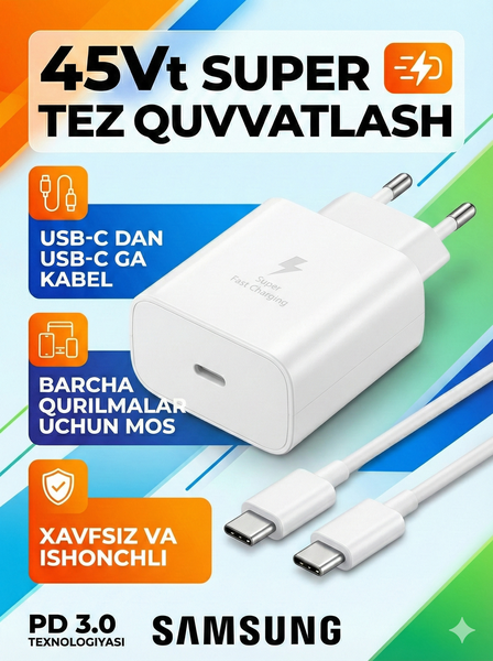 {"widgets":{"@card/DeliveryConsole":{"/content/page/fancyPage/defaultPage/deliveryConsole":{"configType":"MAIN_DO","shouldShowDeliveryPointAgitationBanner":true,"urlSlug":"adapter-dlya-samsung-type-c-zaryadnoye-ustroystvo-45wvatt-pd-fast-charger"}}},"meta":{"/content/page/fancyPage/defaultPage/deliveryConsole":{"name":"@card/DeliveryConsole"}},"collections":{"walterUtils":{"isWalterInitialSuccess":true,"isWalterWithoutFallback":true,"isWalterCanary":false},"deliveryConsole":{"643249517651162923":{"title":"Доставка Маркета","signals":[],"options":[{"title":"Маркет","type":"MARKET","isChecked":true,"transitionId":"tr_14483243035370679204","subtitle":{"date":{"value":"Завтра","features":["THINGRAY"]},"price":{"value":0,"valueFeatures":["THINGRAY"],"currency":"UZS","currencyFeatures":["THINGRAY"]}},"details":[{"title":"","deliveryOptions":[{"id":"13843283203681349321","address":{"addressLine":"Ташкент","addressLineObject":{"abbreviativePart":"Ташкент","isRegion":true,"isTagged":false}},"additionalInfo":"","signals":[{"title":{"content":[{"type":"literal","value":"15-30 мин. курьером в удобный момент"},{"type":"icon","value":"ai_chevron"},{"type":"newline","value":""}],"feature":"PRIMARY"},"analytics":{"type":"onClickSignal","text":"15-30 мин. курьером в удобный момент"},"popupInfoId":"pp_18064787403457921207"}]},{"id":"13843283203681349322","address":{"addressLine":"Ташкент","addressLineObject":{"abbreviativePart":"Ташкент","isRegion":true,"isTagged":false}},"additionalInfo":"","signals":[]}],"signals":[]}],"baobabModel":{"deliveryType":"ON_DEMAND","deliveryDays":1,"priceValue":0,"priceCurrency":"UZS","deliveryDateFrom":"2026-02-25","deliveryDateTo":"2026-02-25","deliveryText":"Завтра, по клику","precise":true,"selected":false,"calculatedFor":"1104c838b83f79c008df7d7a05c6846d;IzCEct61c_TWp774RHafLw"}}]}},"deliveryInfoOption":{"13843283203681349321":{"dayFrom":1,"dayTo":1,"deliveryType":"onDemand","date":{"value":"Завтра","features":["BOLD"]},"service":{"value":"по клику","features":["THINGRAY"]},"deliveryPrice":{"value":0,"currency":"UZS"},"price":{"value":0,"valueFeatures":["THINGRAY"],"currency":"UZS","currencyFeatures":["THINGRAY"]},"style":"BLUE","baobabModel":{"deliveryType":"ON_DEMAND","deliveryDays":1,"priceValue":0,"priceCurrency":"UZS","deliveryDateFrom":"2026-02-25","deliveryDateTo":"2026-02-25","deliveryText":"Завтра, по клику","precise":true,"selected":false,"calculatedFor":"1104c838b83f79c008df7d7a05c6846d;IzCEct61c_TWp774RHafLw"},"consoleDate":{"value":"Завтра","features":["THINGRAY"]}},"13843283203681349322":{"dayFrom":1,"dayTo":1,"deliveryType":"pickup","date":{"value":"Завтра","features":["BOLD"]},"service":{"value":"пункт выдачи","features":["THINGRAY"]},"deliveryPrice":{"value":0,"currency":"UZS"},"price":{"value":0,"valueFeatures":["THINGRAY"],"currency":"UZS","currencyFeatures":["THINGRAY"]},"style":"WHITE","baobabModel":{"deliveryType":"PICKUP","deliveryDays":1,"priceValue":0,"priceCurrency":"UZS","deliveryDateFrom":"2026-02-25","deliveryDateTo":"2026-02-25","deliveryText":"Завтра, пункт выдачи","precise":true,"selected":false,"calculatedFor":"4e2fe580b4414153180565c74f847b4b;IzCEct61c_TWp774RHafLw"},"consoleDate":{"value":"Завтра","features":["THINGRAY"]}}}}}