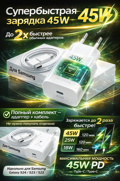 Samsung 45W PD Адаптер: Идеальное Сочетание Скорости и Надежности! Уважаемый Покупатель! Наш 10-летний опыт подтверждает: когда речь идет о зарядке, важны скорость и безопасность. Оригинальный Samsung 45W PD Adapter – это премиальное решение для быстрой зарядки: Супербыстрая Зарядка 45W : Благодаря технологии Power Delivery (PD) $3.0$, этот адаптер обеспечивает максимальную скорость зарядки для совместимых устройств. Идеально для флагманов и мощных гаджетов! a Защита Вашей Батареи: Как оригинальный продукт Samsung, он оснащен встроенными системами защиты от перегрева, перенапряжения и короткого замыкания, что продлевает срок службы вашего аккумулятора. Универсальность USB-C: Адаптер идеально подходит не только для смартфонов Samsung, но и для зарядки любых PD-совместимых устройств: MacBook, iPad, ноутбуков и других гаджетов с разъемом Type-C. Компактный "Travel Adapter": Легкий и удобный, он станет незаменимым аксессуаром в любой поездке. Выберите оригинальное качество и скорость. Закажите Samsung W45 PD Адаптер сейчас!