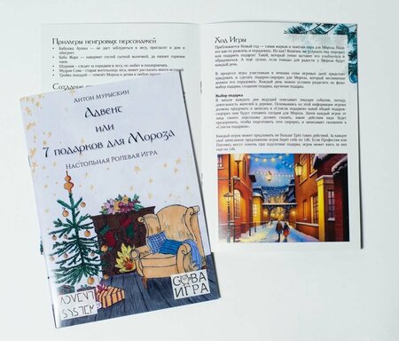 «Адвент, или 7 подарков для Мороза» — это настольная ролевая игра, посвящённая маленьким помощникам самого праздничного старика на свете. Игра разработана студией «Сова Игра». До Нового года осталась всего неделя, но у Мороза совсем нет времени на отдых. Он буквально зашивается. Кто-то же должен о нём позаботиться! Разве можно оставить без подарка и торжественного настроения сам символ праздника? Конечно же нет. Главные герои игры — дети из небольшого городка, которые решили взять дело в свои руки. В игре вы найдёте: