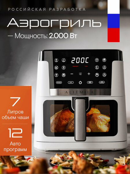 Аэрогриль Alitmila с объемной 7‑литровой чашей – это продуманное решение для кухни, которое легко заменит целый арсенал техники. Он берёт на себя работу тостера, гриля, пароварки, духовки, даже микроволновки и сушилки для продуктов. 7 литров полезного пространства достаточно, чтобы приготовить полноценный ужин на всю семью или угостить гостей горячими блюдами прямо к столу. Большие порции мяса, овощи, гарнир или выпечка – всё готовится одновременно и без постоянного контроля. 12 автоматических программ избавляют от догадок и настройки температуры - достаточно выбрать нужный режим, а аэрогриль сам подберет оптимальные параметры. Хочется больше творчества? Есть ручной режим с регулировкой температуры от 80 до 200°C и таймером до 60 минут, чтобы воплотить любые кулинарные идеи. Мощность 2000Вт обеспечивает быстрый нагрев и равномерное приготовление - стейки остаются сочными, овощи хрустят, а выпечка радует золотистой корочкой. Alitmila заботится не только о вкусе, но и о вашем времени: антипригарное покрытие и съемные аксессуары легко моются, а сама конструкция продумана так, чтобы после готовки кухня оставалась чистой. В комплекте вы найдете всё для комфортного использования: решетку для равномерного приготовления. Аэрогриль Alitmila - это не просто техника, а настоящий центр вашей кухни. Он сочетает функции сразу нескольких приборов, экономит место и делает процесс приготовления проще, быстрее и вкуснее - дома, но на уровне любимого ресторана.