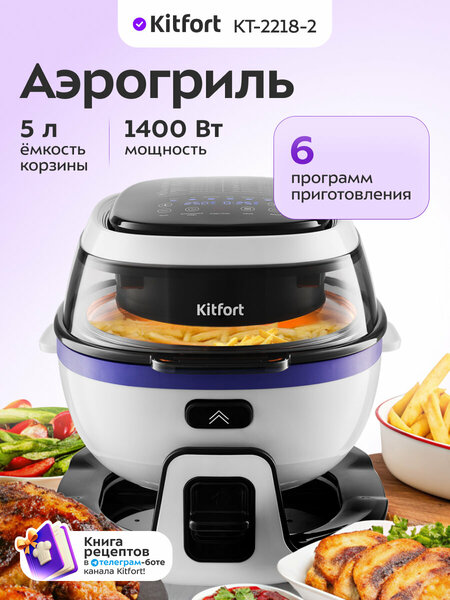 Современный классический аэрогриль Kitfort КТ-2218 замечателен стильным дизайном, а также позволяет готовить большинство продуктов без добавления масла. При помощи системы циркуляции горячего воздуха продукты равномерно обжариваются со всех сторон и получаются нежными внутри и с хрустящей корочкой снаружи. Аэрогриль оснащен электронным управлением и дисплеем, а также у прибора есть 6 автоматических программ. Вы можете начать приготовление в более позднее время, используя функцию отложенного старта. На дисплее отображаются температура, время приготовления и скорость вращения вентилятора.