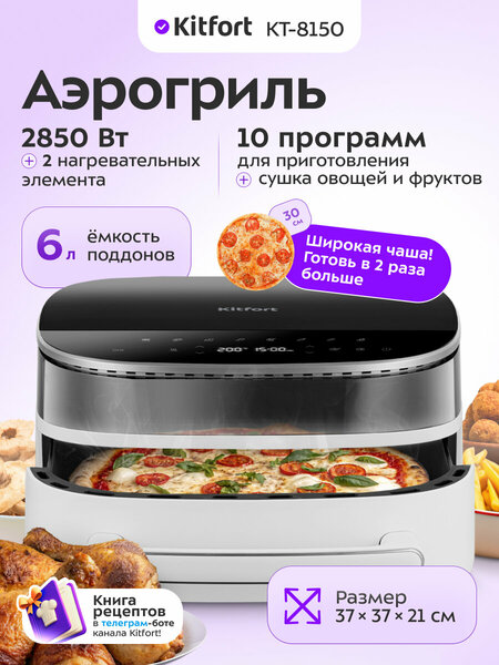 Хрустящее снаружи, нежное внутри! Современный аэрогриль КТ-8150 позволяет готовить большинство продуктов без добавления масла, при этом они получаются сочными и с хрустящей корочкой. Также данная модель может использоваться как сушилка для овощей и фруктов. Более здоровая пища Для приготовления в аэрогриле не нужно масло, а для создания хрустящей корочки или для ароматизации масляно-травяной смесью достаточно слегка смазать курицу, рыбу или отбивную с помощью силиконовой кисточки. Два нагревателя для равномерной готовки В данной модели два нагревателя: верхний нагреватель представляет собой галогеновую трубку, а нижний — ТЭН. Вентилятор, который работает во время приготовления, создает циркуляцию воздуха, что позволяет избежать непропеченных или непрожаренных участков. 10 автоматических программ Аэрогриль оснащён сенсорным управлением и 10 автоматическими программами приготовления. Программы позволяют использовать готовые шаблоны настроек, разработанные специально под конкретные блюда, поэтому вам не придется настраивать температуру и время приготовления Простой уход Продукты готовятся на специальной решётке, установленной в поддон. На решётку и внутреннюю поверхность поддона нанесено антипригарное покрытие. Поддон и решётку легко снять и очистить. Наблюдайте за готовкой Аэрогриль КТ-8150 имеет оригинальную форму и лаконичный дизайн. Он отлично впишется в вашу кухню, а благодаря небольшому размеру не займёт много места на вашей кухне. Через смотровое окно вы можете контролировать процесс приготовления.