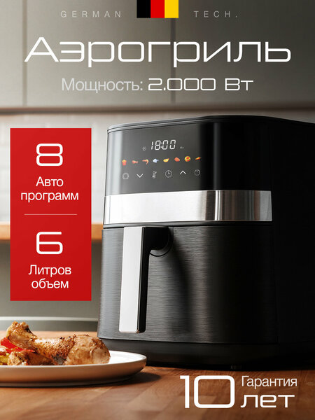 Аэрогриль на 6 литров, мощность 2000 Вт, с сенсорным управлением, 8 программ