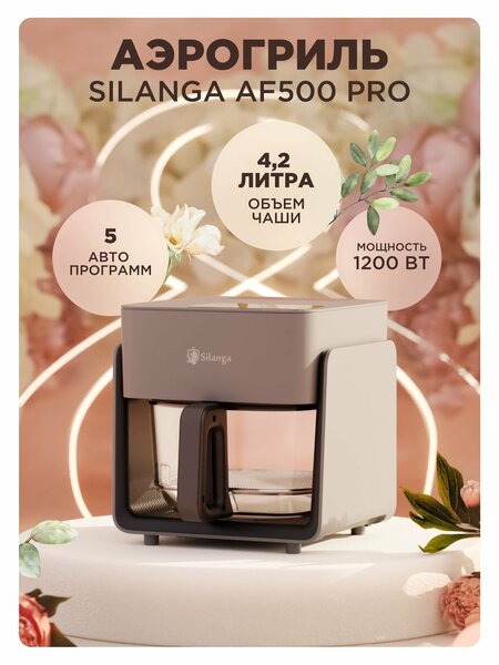 Аэрогриль Silanga AF500 PRO: инновационная техника для вашей кухни Аэрогриль Silanga AF500 PRO — это современный и удобный бытовой гаджет, который станет незаменимым помощником на вашей кухне. С его помощью вы сможете готовить разнообразные блюда: от хрустящего картофеля фри до ароматного хлеба. Основные характеристики: * Карбоновый нагреватель: аэрогриль оснащен мощным карбоновым нагревателем, который обеспечивает равномерный нагрев и высокую надежность устройства. * Стеклянная чаша: в аэрогриле используется стеклянная чаша на 4.2 литра, которая устойчива к высоким температурам и легко очищается после использования. * Простота использования: управление аэрогрилем интуитивно понятно и просто. Вы сможете легко настроить необходимые параметры приготовления и наслаждаться вкусными блюдами. * Многофункциональность: с аэрогрилем Silanga AF500 PRO вы сможете готовить разнообразные блюда — от запеканок до десертов. Это идеальный выбор для тех, кто любит экспериментировать на кухне. Преимущества: * Оригинальный дизайн: аэрогриль Silanga AF500 PRO имеет стильный и современный дизайн, который впишется в любой интерьер кухни. * Безопасность: благодаря использованию качественных материалов, продуманной конструкции и различным электронным системам безопасности аэрогриль обеспечивает безопасное приготовление блюд. * Функция подачи воды: Silanga AF500 PRO оснащен функцией распыления воды, что позволит приготовить блюда с идеальной корочкой и сохранить сочность. Почему стоит выбрать аэрогриль Silanga AF500 PRO? * Высокое качество: аэрогриль изготовлен из высококачественных материалов и оснащен надежными компонентами, что гарантирует его долговечность и надежность. * Универсальность: с аэрогрилем вы сможете готовить разнообразные блюда, экспериментируя с различными рецептами и ингредиентами. * Удобство использования: управление аэрогрилем интуитивно понятно, а его конструкция обеспечивает легкость в уходе и чистке. * Дизайн: современный дизайн AF500 PRO украсит вашу кухню и станет предметом вдохновения на новые кулинарные шедевры. Не упустите возможность приобрести аэрогриль Silanga AF500 PRO по выгодной цене. Он станет незаменимым помощником на вашей кухне и поможет вам готовить вкусные и здоровые блюда для всей семьи. Готовьте вкусно вместе с Silanga!