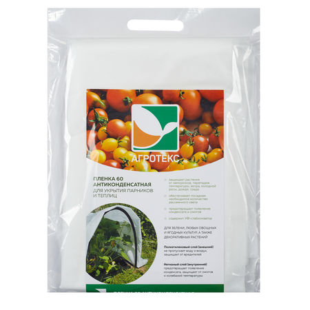 Протестировано "Всероссийским научным центром овощеводства" Двухслойная антиконденсатная плёнка Микс 60 для выращивания огурцов в парниках и теплицах Внешний водонепроницаемый слой - защита от осадков и вредителей. Внутренний нетканый слой - защита от конденсата и колебаний температуры. Помогает: - избежать потери рассады; - защитить растения от вредителей; - защитить растения от дождя и града; - предотвратить появление и скопление конденсата; - защитить от резких скачков температуры и ожогов. Водонепроницаемый материал применяется для укрытия грядок и парников на дугах, а также каркасных теплиц. Помогает сохранить рассаду и сэкономить средства на покупке новых растений, исключая возможность потерь из-за воздействия неблагоприятных погодных условий. Комбинированный водонепроницаемый материал помогает создать оптимальные условия для роста растений. Подходит для выращивания: зелени, любых овощных и ягодных культур, а также декоративных растений при укрытии на каркасы. Инструкция: На подготовленную грядку установить дуги, высадить рассаду, затем укрыть каркас материалом, фиксируя его у основания дуг. Условия хранения: материал нетканый должен храниться в условиях, обеспечивающих защиту от воздействия влаги (влажность в помещении – не более 75 %), прямых солнечных лучей, при температуре в местах хранения от - 15°С до + 35°С. Гарантия изготовителя: при соблюдении потребителем правил транспортирования и хранения, а также при отсутствии воздействия на материал ТМ "Агротекс" химических удобрений и средств защиты растений, в т. ч. серы, серо- и галогенсодержащих. Состав: 100% полипропилен с добавлением УФ-стабилизатора. Срок годности: 24 месяца с даты изготовления.