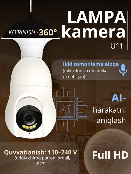 {"widgets":{"@card/UniversalPromoBadge":{"/content/page/fancyPage/defaultPage/universalPromoBadge":{"wrapperProps":{"margins":{"bottom":"3"}},"initialTime":1771441516323,"offerComposeId":"11190106720345563663"}}},"meta":{"/content/page/fancyPage/defaultPage/universalPromoBadge":{"name":"@card/UniversalPromoBadge"}},"collections":{"productServiceSnippets":{"11190106720345563663":{"productSnippet":{"snippetId":"document_id","type":"MODEL_CARD_LAYOUT","productPayload":{"snippetStyle":"NORMAL","title":{"value":"AI SmartCam 360 E27 — Умная Wi-Fi IP-камера в цоколе лампы с Full HD, ночным видением и вращением 355°"},"badges":{},"price":{"actualPrice":{"amount":{"intPart":319000,"currency":"UZS"},"style":"RED","type":"OTHER_DISCOUNT"},"oldPrice":{"amount":{"intPart":600000,"currency":"UZS"},"style":"STRIKETHROWED"}},"gallery":{"mediaItems":[{"picture":{"baseUrl":"https://avatars.mds.yandex.net/get-mpic/5486142/2a00000197fadb69f57191c07d0f4865af8d/","width":1080,"height":1440,"title":"AI SmartCam 360 E27 — Умная Wi-Fi IP-камера в цоколе лампы с Full HD, ночным видением и вращением 355°"},"type":"IMAGE"},{"picture":{"baseUrl":"https://avatars.mds.yandex.net/get-mpic/11824272/2a00000197fadb69f5622780a01f7b87688d/","width":1080,"height":1440,"title":"AI SmartCam 360 E27 — Умная Wi-Fi IP-камера в цоколе лампы с Full HD, ночным видением и вращением 355°"},"type":"IMAGE"},{"picture":{"baseUrl":"https://avatars.mds.yandex.net/get-mpic/7979862/2a00000197fadb69f61fbf96b1b1afb98d54/","width":1080,"height":1440,"title":"AI SmartCam 360 E27 — Умная Wi-Fi IP-камера в цоколе лампы с Full HD, ночным видением и вращением 355°"},"type":"IMAGE"},{"picture":{"baseUrl":"https://avatars.mds.yandex.net/get-mpic/4458042/2a00000197fadb69f7b2c958b98eee461a5a/","width":1080,"height":1440,"title":"AI SmartCam 360 E27 — Умная Wi-Fi IP-камера в цоколе лампы с Full HD, ночным видением и вращением 355°"},"type":"IMAGE"},{"picture":{"baseUrl":"https://avatars.mds.yandex.net/get-mpic/15257343/2a00000197fadb69f5b518119f29e1da1806/","width":1080,"height":1440,"title":"AI SmartCam 360 E27 — Умная Wi-Fi IP-камера в цоколе лампы с Full HD, ночным видением и вращением 355°"},"type":"IMAGE"},{"picture":{"baseUrl":"https://avatars.mds.yandex.net/get-mpic/16317423/2a00000197fadb69f5745f99c129bdd472da/","width":1080,"height":1440,"title":"AI SmartCam 360 E27 — Умная Wi-Fi IP-камера в цоколе лампы с Full HD, ночным видением и вращением 355°"},"type":"IMAGE"},{"picture":{"baseUrl":"https://avatars.mds.yandex.net/get-mpic/15243415/2a00000197fadb69f4ddef2fd0e5339a65fb/","width":1080,"height":1440,"title":"AI SmartCam 360 E27 — Умная Wi-Fi IP-камера в цоколе лампы с Full HD, ночным видением и вращением 355°"},"type":"IMAGE"},{"picture":{"baseUrl":"https://avatars.mds.yandex.net/get-mpic/15256585/2a00000197fadb69f650e657ff0ea85104cc/","width":1080,"height":1440,"title":"AI SmartCam 360 E27 — Умная Wi-Fi IP-камера в цоколе лампы с Full HD, ночным видением и вращением 355°"},"type":"IMAGE"},{"picture":{"baseUrl":"https://avatars.mds.yandex.net/get-mpic/15243415/2a00000197fadb69f5ec6090c519219840df/","width":1080,"height":1440,"title":"AI SmartCam 360 E27 — Умная Wi-Fi IP-камера в цоколе лампы с Full HD, ночным видением и вращением 355°"},"type":"IMAGE"},{"picture":{"baseUrl":"https://avatars.mds.yandex.net/get-mpic/15303770/2a00000197fadb69f4e37864fd836c4f0469/","width":1080,"height":1440,"title":"AI SmartCam 360 E27 — Умная Wi-Fi IP-камера в цоколе лампы с Full HD, ночным видением и вращением 355°"},"type":"IMAGE"},{"picture":{"baseUrl":"https://avatars.mds.yandex.net/get-mpic/16442410/2a00000197fadb69fb091774e63340a54456/","width":1080,"height":1440,"title":"AI SmartCam 360 E27 — Умная Wi-Fi IP-камера в цоколе лампы с Full HD, ночным видением и вращением 355°"},"type":"IMAGE"},{"picture":{"baseUrl":"https://avatars.mds.yandex.net/get-mpic/15265369/2a00000197fadb69f42b7291761bd80bcd35/","width":1080,"height":1440,"title":"AI SmartCam 360 E27 — Умная Wi-Fi IP-камера в цоколе лампы с Full HD, ночным видением и вращением 355°"},"type":"IMAGE"},{"picture":{"baseUrl":"https://avatars.mds.yandex.net/get-mpic/4081122/2a00000197fadb69f3564bfe74cb5f554ae5/","width":1080,"height":1440,"title":"AI SmartCam 360 E27 — Умная Wi-Fi IP-камера в цоколе лампы с Full HD, ночным видением и вращением 355°"},"type":"IMAGE"},{"picture":{"baseUrl":"https://avatars.mds.yandex.net/get-mpic/15419534/2a00000197fadb69f4c181b10d4a7ad6df94/","width":1080,"height":1440,"title":"AI SmartCam 360 E27 — Умная Wi-Fi IP-камера в цоколе лампы с Full HD, ночным видением и вращением 355°"},"type":"IMAGE"},{"picture":{"baseUrl":"https://avatars.mds.yandex.net/get-mpic/12263081/2a00000197fadc5a8076539b5e674ee89390/","width":1080,"height":1440,"title":"AI SmartCam 360 E27 — Умная Wi-Fi IP-камера в цоколе лампы с Full HD, ночным видением и вращением 355°"},"type":"IMAGE"},{"picture":{"baseUrl":"https://avatars.mds.yandex.net/get-mpic/15551943/2a00000197fadc5a87ca5732ce83f3b1cf06/","width":1080,"height":1440,"title":"AI SmartCam 360 E27 — Умная Wi-Fi IP-камера в цоколе лампы с Full HD, ночным видением и вращением 355°"},"type":"IMAGE"},{"p