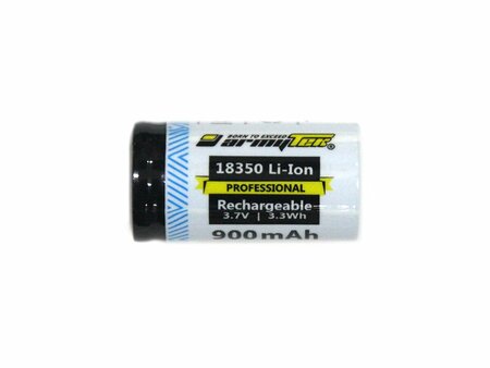 Аккумулятор 18350 Li-Ion Armytek 900 mAhЭкономичный и экологически безопасный аккумулятор 18350 Li-Ion. Можно заряжать более 500 раз, что равно 500 одноразовым батарейкам CR123A. Характеристики: высококачественная химия без платы защиты плоский контакт + предохранительное вентиляционное отверстие для защиты от перегрева выходное напряжение аккумулятора 3.7V