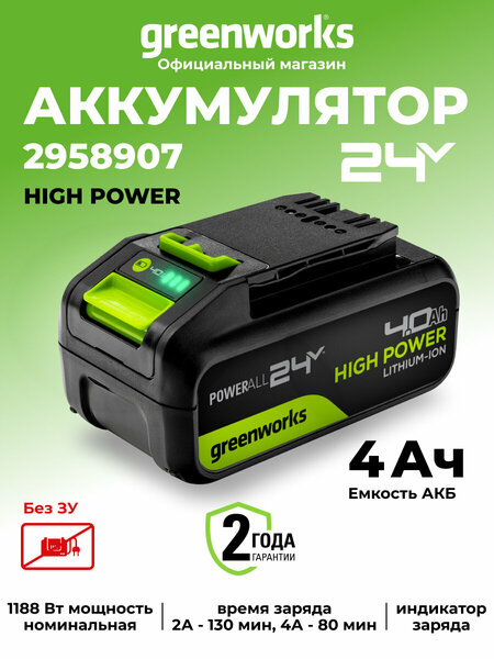 Аккумулятор Greenworks High Power G24HP4, 24V, 4Ач (2958907). Новое поколение аккумуляторных батарей Greenworks High Power 24V с высокой отдаваемой мощностью и долгим сроком службы. G24HP4 - универсальная аккумуляторная батарея ёмкостью 4 Ач предназначено для устройств платформы 24V Greenworks ( кроме вертикальных пылесосов GD24SV - 4701407, 4701407UB, 4700607UB, 4701107UB). Высокая номинальная мощность батареи G24HP4 полностью раскрывает потенциал всех устройств платформы POWERALL 24V. Новый компактный и прочный корпус обеспечивает защиту всех компонентов батареи и имеет легко узнаваемый, современный внешний вид. Обновленная электроника Greenworks Intelligent Power обеспечивает высокую отдаваемую мощность и управляет батареей, инструментом и зарядным устройством, для максимальной производительности инструмента с гарантией 2 года. Система Greenworks Intelligent Power обеспечивает защиту аккумуляторного блока G24HP4 от перегрева, от перегрузки, от глубокого разряда, от перезаряда, продлевая тем самым его срок службы. Батарея G24HP4 построена на основе литий-ионных элементов тип 18650, которые не имеют эффекта памяти, обладают большим сроком службы и с минимальным саморазрядом во время хранения. Для удобного контроля уровня заряда пользователем батарея G24HP4 оснащена фронтальным индикатором с обратной связью. Технические данные: Напряжение 100% заряда: 24V; Рабочее напряжение: 21,6V; Ёмкость: 4 Ач; Энергоёмкость: 86,4 Вт*ч; Номинальная мощность: 1188 Вт; Масса без упаковки: 0,8 кг; Встроенная защита: от перегрева, от перегрузки, от глубокого разряда, от перезаряда; Время заряда до 100%: - от ЗУ ток 2 А: 130 мин*; - от ЗУ ток 4 А: 80 мин*. * зависимости от уровня заряда и температуры аккумуляторной батареи реальное время заряда может отличаться от указанного в технических характеристиках. Рекомендуемая температура окружающей среды во время зарядки: +4°C ~ + 40°C. Оставляем за собой право на изменения, обусловленные техническим прогрессом. Гарантия 2 года с даты продажи. Комплектация: Аккумуляторный блок; Руководство по эксплуатации; Гарантийный талон. Внимание: АКБ поставляется без ЗУ.