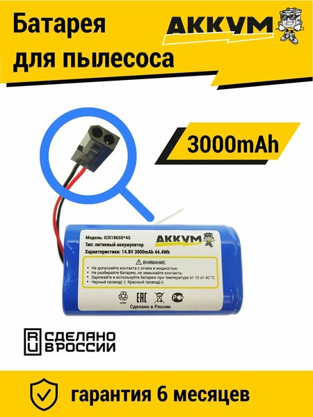 Батареи c литиевыми аккумуляторами (Li-ion) в отличии от никелевых не имеют эффекта памяти! Дополнительные преимущества: увеличенный запас емкости при меньшем весе плата защиты АКБ выдача более высокого напряжения постоянная готовность к эффективной эксплуатации сделано В россии. Совместимые модели: Xiaomi Mijia Essential G1 MJSTG1 - SKV4135CN SKV4135CN Xiaomi Mi Robot Vacuum Mop Essential - SKV4136GL / MJSTG1 MJSTG1 FLYCO FC9601 FLYCO FC9602 Mijia G1 - MJSTG1 Panasonic MC-WRC53 Phicomm X3 Puppyoo R30 PuppyooR30 Pro Puppyoo R35 Puppyoo WP650 Rowenta RR6825 EXPLORER SERIES 20 Rowenta RR6871 Rowenta RR6875 Rowenta RR6925 SMART FORCE ESSENTIAL Rowenta RR6926 Rowenta RR6927 Rowenta RR6933 Rowenta RR6943 Rowenta RR6971 Rowenta RR6976 Rowenta RR7245 EXPLORER SERIES 40 Rowenta RR7255 Rowenta RR7267 Rowenta RR7275 Rowenta RR7427 EXPLORER SERIES 60 Rowenta RR7447 Rowenta RR7455 Tefal RG6825 EXPLORER SERIES 20 Tefal RG6825WH Tefal RG6871 Tefal RG6875 Tefal RG6971 Tefal RG7267 EXPLORER SERIES 40 Tefal RG7275 SMART FORCE ESSENTIAL Tefal RG7447 EXPLORER SERIES 60 Tefal RG7455 Tefal RG7455WH Tefal RS-2230001696 UPCAN X3 R2 XROBOT M-788A Батарея имеет емкость 3000mAh. Собрана из высокотоковых литиевых аккумуляторов, что позволит увеличить срок службы батареи.
