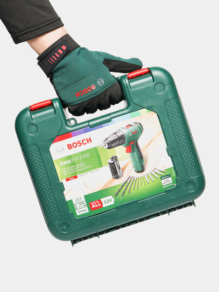 Аккумуляторная дрель-шуруповерт Bosch EasyDrill 1200 (Home & Garden) Bosch EasyDrill 1200 — это компактная, легкая и интуитивно понятная аккумуляторная дрель-шуруповерт, что делает ее идеальным первым инструментом для любого дома. Она прекрасно подходит для всех базовых задач по сборке и сверлению в дереве и металле, сочетая в себе удивительную мощность и исключительное удобство использования. Ключевые технологии и преимущества: Оптимальная мощность для каждой задачи: 2-скоростной редуктор обеспечивает универсальность инструмента. 1-я скорость дает высокий крутящий момент для завинчивания шурупов, а 2-я — высокую скорость для сверления. 20 ступеней крутящего момента позволяют точно контролировать усилие, чтобы закручивать шурупы вровень с поверхностью, не повреждая материал или головку шурупа. Исключительная компактность и легкость: Легкий вес инструмента (около 0,95 кг с аккумулятором) и его малый размер делают его идеальным для работы в узких пространствах, над головой или в течение длительного времени без усталости. Простота и удобство использования: Одномуфтовый быстрозажимной патрон 10 мм позволяет легко и быстро менять оснастку (биты и сверла) одной рукой. Встроенный светодиод освещает рабочую зону, помогая работать точно даже в темных углах. Система POWER FOR ALL 12V: EasyDrill 1200 является частью альянса POWER FOR ALL 12V. Это означает, что один 12-вольтовый аккумулятор подходит ко множеству других домашних и садовых инструментов Bosch (лобзикам, шлифмашинам и т. д.), обеспечивая гибкость и экономию средств. Специализация и области применения: Сборка и разборка мебели (шкафы, столы, стулья). Установка карнизов, полок и картин. Сверление отверстий в дереве (до 20 мм) и металле (до 8 мм). Выполнение различных мелких ремонтных работ по дому. Технические характеристики: Бренд: Bosch (Home & Garden) Модель: EasyDrill 1200 Напряжение: 12 В Аккумуляторная система: POWER FOR ALL 12V Крутящий момент (мягкий/жесткий): 18 / 30 Нм Число оборотов (1/2-я скорость): 0–400 / 0–1.500 об/мин Ступени крутящего момента: 20 + 1 (режим сверления) Патрон: 10-мм быстрозажимной патрон Вес (с аккумулятором 2.0 А·ч): 0,95 кг