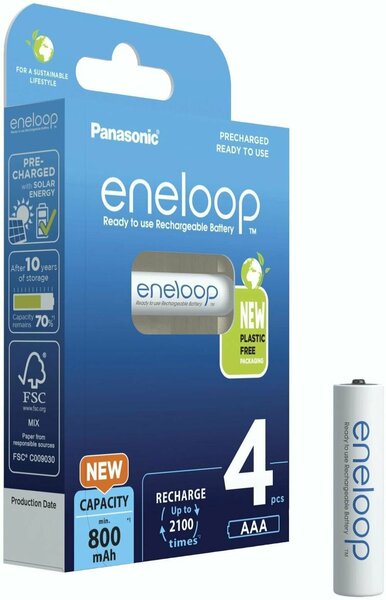 Новинка! Усовершенствовано! Увеличен срок хранения энергии! Стандартная модель демонстрирует низкий саморазряд, большое количество циклов заряд / разряд и может быть использована в широком диапазоне устройств для обеспечения длительного и надежного электропитания. Оптимальное сочетание высокой емкости (мин. 2000 mAh для АА, 800 mAh для ААА) и большого количества циклов заряд / разряд – до 2 100 раз. • Сохраняют до 70% энергии после 10 лет хранения*. • Eneloop можно использовать 2100 раз • Уникальные технологии уменьшают саморазряд, eneloop сохраняет емкость 70% даже после 10 лет хранения. • Работает дольше, чем щелочная батарея, благодаря стабильному напряжению. • Может использоваться при низких температурах, например, на горнолыжных курортах. • Поддерживает более высокое напряжение, чем щелочная батарея, при низких температурах. • Упаковка без пластика
