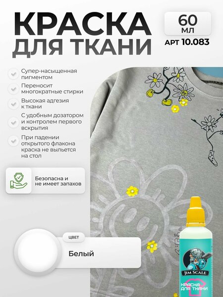 {"widgets":{"@card/UniversalPromoBadge":{"/content/page/fancyPage/defaultPage/universalPromoBadge":{"wrapperProps":{"margins":{"bottom":"3"}},"initialTime":1771525447018,"offerComposeId":"2769853264394531223"}}},"meta":{"/content/page/fancyPage/defaultPage/universalPromoBadge":{"name":"@card/UniversalPromoBadge"}},"collections":{"productServiceSnippets":{"2769853264394531223":{"productSnippet":{"snippetId":"document_id","type":"MODEL_CARD_LAYOUT","productPayload":{"snippetStyle":"NORMAL","title":{"value":"Акриловая краска для ткани и одежды Jim Scale: Белый 60 мл"},"badges":{},"price":{"actualPrice":{"amount":{"intPart":142067,"currency":"UZS"},"style":"RED","type":"OTHER_DISCOUNT"},"oldPrice":{"amount":{"intPart":284135,"currency":"UZS"},"style":"STRIKETHROWED"}},"signals":{"customsFee":{"text":{"text":"Возможна пошлина"}},"lastStock":{"text":{"text":"Осталась 1 шт"},"level":"CRITICAL"}},"gallery":{"mediaItems":[{"picture":{"baseUrl":"https://avatars.mds.yandex.net/get-mpic/16146719/2a00000197f9ee7c4e79d204849c0545331f/","width":1200,"height":1600,"title":"Акриловая краска для ткани и одежды Jim Scale: Белый 60 мл"},"type":"IMAGE"}]},"rating":{"ratingValue":4.2,"ratingCount":20,"reviewsCount":12,"ratingCountStats":{"cnt1":2,"cnt2":2,"cnt3":0,"cnt4":2,"cnt5":14},"snippet":{"rating":"4.2","type":"product","description":"(20) · 88 купили","descriptionList":["(20)","88 купили"],"ratingStar":"4"}},"wishlistButton":{"businessId":212017102,"mskuId":4516759711,"modelId":1281197199,"oskuId":4516759711,"offerId":"hizk0g2PVNbENSuJji3ItQ"},"productRating":{"rating":"4.2","type":"product","description":"(20) · 88 купили","descriptionList":["(20)","88 купили"],"ratingStar":"4"}},"baobabPayload":{"type":"offer","wareId":"hizk0g2PVNbENSuJji3ItQ","modelId":1281197199,"marketSku":"4516759711","snippet_type":"product","isExpress":false,"price":284135,"additionalPrices":[{"priceType":"withDiscount","priceValue":142067},{"priceType":"unknown","priceValue":284135}],"hid":64657678,"shopId":431782,"shopSku":"10.083","supplierId":216403060,"supplierType":3,"isUltima":false,"oskuId":4516759711,"snippetTheme":"GRID_FULL","stockCount":1,"rating":{"rating":"4.2","purchaseCount":"88","gradesCount":"20","ratingType":"product"},"promoLogJoinId":"d98186734fb2585695fd1b36dab1a4b7/abdf3ad69e72915b","shopPromoIds":["cf_bp_1000325"]},"themeType":"GRID_FULL"}}}}}