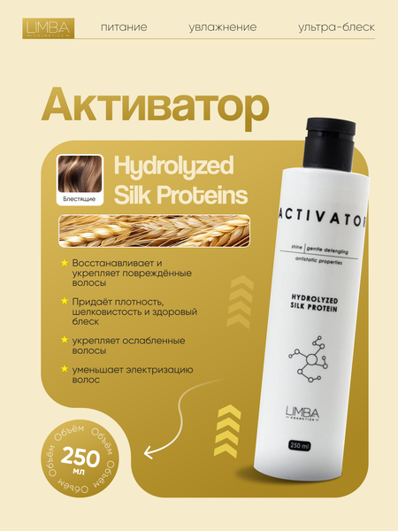 Активатор протеинов шелка Limba Cosmetics Activator Hydrolyzed Silk Protein, 250 мл Limba Cosmetics Activator Hydrolyzed Silk Protein — это высококонцентрированный актив, предназначенный для придания волосам исключительной мягкости, гладкости и зеркального блеска. В отличие от тяжелых белков, протеины шелка работают на создание защитной вуали и интенсивное увлажнение кутикулярного слоя. Основные преимущества: Невероятная мягкость: Шелк обволакивает каждый волос, делая его приятным на ощупь (эффект «шелкового полотна»). Зеркальный блеск: Выравнивает поверхность волоса, что значительно усиливает светоотражение. Интенсивное увлажнение: Удерживает влагу в 7 раз эффективнее других компонентов, предотвращая сухость и «пушистость». Защита: Формирует легкую эластичную пленку, которая защищает от воздействия окружающей среды и фена. Антистатический эффект: Устраняет проблему наэлектризованных волос. Ключевой ингредиент: Hydrolyzed Silk (Гидролизованный шелк): Содержит аминокислоты, которые легко встраиваются в структуру поврежденного волоса, разглаживают чешуйки и предотвращают потерю влаги. Способ применения: Активатор можно использовать несколькими способами: С маской/бальзамом: Смешайте 2-5 мл активатора с порцией вашего привычного средства (20-30 мл). Нанесите на чистые влажные волосы, выдержите 10-15 минут и смойте. В процедурах реконструкции: Используется мастерами как этап «шелкового наполнения» в многоступенчатых программах ухода. Создание миксов: Можно смешивать с другими активаторами Limba (например, с кератином) для получения индивидуального коктейля под потребности волос. Объем: 250 мл Тип волос: Тусклые, жесткие, сухие, «пушащиеся» и лишенные блеска волосы.