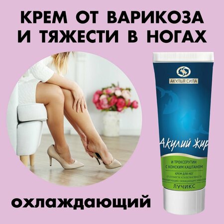 "Акулий жир, троксерутин с конским каштаном"- это уникальный комплексный препарат для быстрого, а самого главного явного получения результата при проявлении венозных нарушений. Благодаря содержанию акульего жира, троксерутина и конского каштана крем оказывает тонизирующее действие, способствует устранению усталости. Входящие в состав эфирные масла и ментол создают легкое приятное ощущение прохлады, расслабляют, снимают напряжение в ногах, обеспечивая чувство комфорта. высокоэффективные активные компоненты: 1) Экстракт конского каштана - укрепляет стенки капилляров и вен, способствует рассасыванию тромбов и предупреждает их образование. 2) Троксерутин - используется для улучшения микроциркуляции крови, снижения воспалительных процессов и уменьшения отечности. 3) Акулий жир можно использовать с лечебной и профилактической целью. Среди показаний для его применения выделяют: длительно незаживающие кожные заболевания, ожоги, а также дерматиты и высыпания аллергической или инфекционной природы. 4) Эфирные масла - и ментол создают лёгкое приятное ощущение прохлады, расслабляют, снимают усталость и тяжесть в ногах, обеспечивая чувство комфорта Рекомендуется применять: • при варикозном расширении вен; • при сосудистой сеточке на ногах; • при лимфатических отеках; • при венозной недостаточности; • при сосудистых патологиях, для ликвидации застойных явлений; • при ощущении тяжести и отечности в ногах; • при отеках, полученных в результате травм; • при поверхностном тромбофлебите; • при усталости ног. Крем идеально подходит для ежедневного применения после долгого рабочего дня, а так же как профилактическое средство при заболевании вен. Крем-гель "Акулья сила", благодаря своей уникальной формуле, может отсрочить операционное вмешательство и ощутимо понизить болевые или спазмолитические ощущения связанные с заболеванием вен. Прекрасный знак внимания для самых близких людей и надежная поддержка здоровья!
