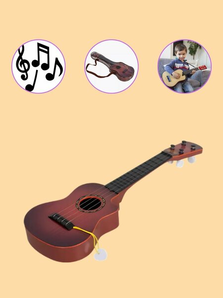 Акустическая гитара: игрушка и музыкальный тренажер Игрушечная гитара станет отличным тренажером для начинающего музыканта. В процессе игры ребенок познакомится с гитарой, научится держать музыкальный инструмент в руках, а также разовьет слух и творческое начало. У гитары 4 железные струны, что делает игру более реалистичной и интересной. Это также способствует развитию мелкой моторики пальчиков ребенка. Комплектация включает гитару, медиатор и чехол. Это позволяет сразу начать игру и хранить гитару в безопасности. Размеры гитары составляют 41*13 см, что делает ее удобной для маленьких рук и легкой для переноски. Выбирая акустическую гитару, вы делаете отличный подарок для своего ребенка, который поможет ему развивать свои музыкальные навыки и творческие способности.