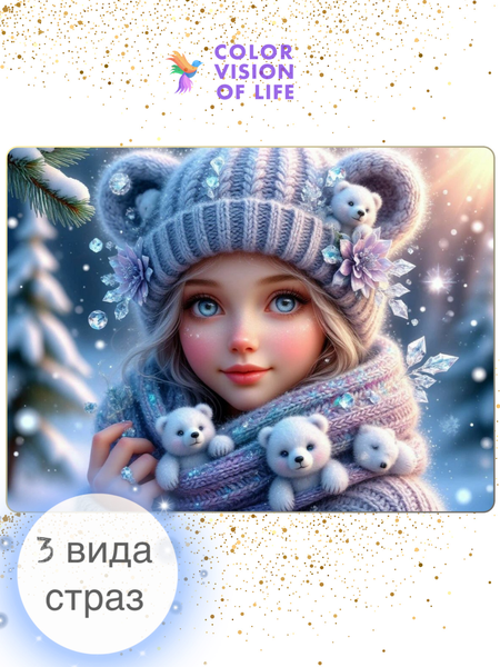 Завораживающая алмазная мозаика «Зимняя сказка» - набор для вышивки стразами с 3D эффектом. Очаровательная девочка в теплой шапке с шарфом, украшенным тремя плюшевыми мишками. Голографические и перламутровые стразы создают эффект зимнего мерцания и снежного блеска. Создавайте шедевры с нами! Алмазная вышивка стразами девочка в шапке с полным заполнением на подрамнике от CVL – это произведение искусства, которое вы создадите своими руками. Алмазные картины становятся всё популярнее, ведь это не просто хобби, это возможность сотворить уникальный декор и атмосферу у себя дома. Алмазная вышивка милый ребенок зимой - это идеально для детской комнаты и новогоднего подарка маленькой принцессе. Наша алмазная мозаика детский портрет с качественной чёткой схемой нанесения сделают процесс максимально комфортным и приятным. Эксклюзивное сплетение CVL - в одном наборе сразу 3вида качественных оригинальных страз: основных непрозрачных, 5D голографических (стразы Swarovski) и перламутровых страз с эффектом сияния - это помогает создать прекрасный игровой эффект света и добавить объёмности в вашу картину. Лицензионная алмазная мозаика девочка зимой. Этот хит продаж станет настоящим украшением интерьера. Размер мозаики 40х30. Размер выкладки 29x39. Холст на подрамнике облегчит процесс выкладки. Набор для алмазной вышивки девочка с мишками включает в себя: • холст со схемой и клеевой основой на подрамнике • цветовая карта для удобства работы • комплект круглых страз (с запасом) • лоток для страз • стилус с гелем и 3 насадками • наклейки с номерами • zip-пакеты для хранения • крепления на стену Позвольте себе большее! Собирая нашу алмазную мозаику, вы получите эстетическое удовольствие, улучшите мелкую моторику, снимете нервное напряжение, улучшите внимание и терпение. Это идеальное занятие для снятия стресса и раскрытия своего творческого потенциала. Получите картину CVL бесплатно! Условия на нашем сайте. С любовью, команда CVL!