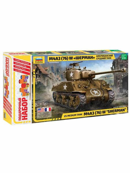 Масштаб 1:35 Детали х 322 Размер, см 16,8 В ходе Второй мировой войны в немецких танковых частях появились новые тяжёлые и средние танки с мощным бронированием «Тигр» и «Пантера». Для борьбы с ними потребовалось вооружить американские танки «Шерман» более мощным орудием, взамен прежней 75-мм пушки. Так появилась модификация М4А3 (76) W – с 76-мм орудием. Ещё одной интересной особенностью была особая «мокрая» боеукладка. При попадании в танк большую опасность для экипажа представляет детонация своих собственных снарядов. У танков же с «мокрой» боеукладкой в промежутки между гнёздами для снарядов в контейнерах заливалась вода, смешанная с антифризом и ингибитором коррозии. Так риск подрыва снарядов при пробитии борта или при пожаре был намного меньше. Производство модификации М4А3 (76) W продолжалось с марта по декабрь 1944 года, за это время построили 1925 таких танков. Состав набора: отливки инструкция по сборке декаль Внимание! В подарочный набор входят только основные краски. В набор входят краски: Серебро 05-АКР Вороненая сталь 08-АКР Черная 20-АКР Оливковая 24-АКР