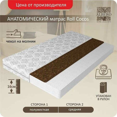 Матрас Albero Roll Cocos, беспружинный, 80х190х16 см, съемный хлопковый